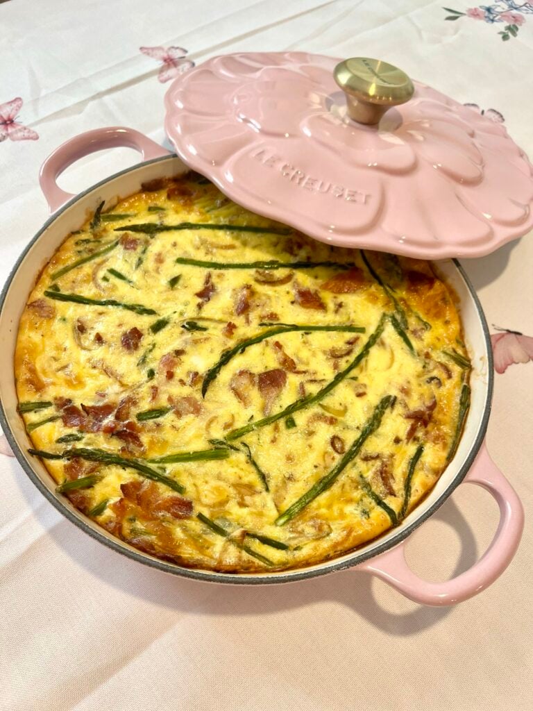 For this Easter brunch, I wanted every detail to feel simple, elegant, and a little bit fancy without being overdone. I baked my quiche in a Le Creuset pink chiffon petal braiser. It not only cooks beautifully but doubles as the prettiest serving piece on the table. Fresh tulips arranged in a crystal vase added that effortless spring charm, while my thrifted antique silver tray became the perfect way to serve appetizers. Especially for caviar deviled eggs! It instantly elevates even the simplest dish. One of my favorite touches is using a champagne ice mold. Filled with flowers, lemon slices, or anything you have on hand. Don’t overthink it, this is where you can get creative and use what you already have around your home or garden. To tie it all together, I kept it simple with a floral tablecloth from Amazon, letting all the pretty details shine. I hope you enjoy these recipes and ideas as much as my family does. Happy Easter friends!